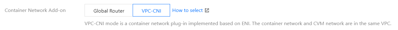 3. 在创建集群页面,在容器网络插件中选择 VPC-CNI。如下图所示: