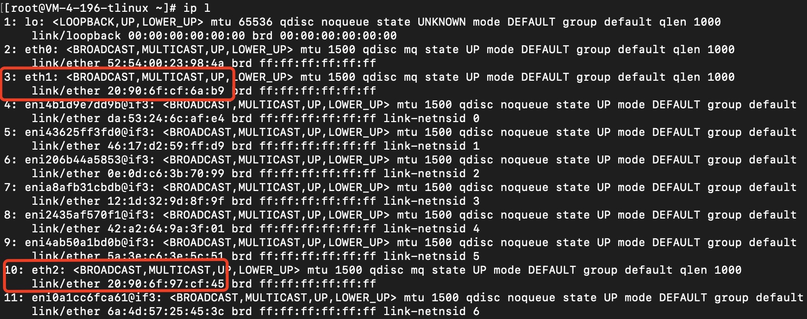 在节点上执行 ip link 可看到节点所有的网络设备信息,通过弹性网卡的 mac 地址比对,可知道其中弹性网卡对应的网络设备。一般情况下,eth0为主网卡,eth1、eth2等为辅助弹性网卡: