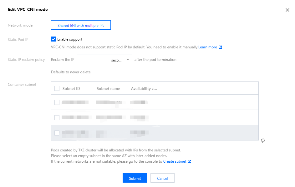 6. 单击提交,即可完成为已有集群开启 VPC-CNI。