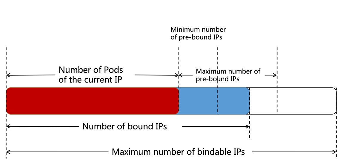 TKE 组件在每个节点维护一个可弹性伸缩的网卡池。已绑定的网卡数量将被维持在 Pod 数量 + 最小预绑定数量及 Pod 数量 + 最大预绑定数量之间: