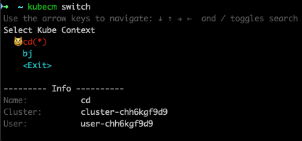 kubecm ls 命令查看 kubeconfig 中的集群列表(星号标识的是当前操作的集群)。示例如下:$ kubecm ls+------------+------------+-----------------------+--------------------+-----------------------------------+-------------------+| CURRENT | NAME | CLUSTER | USER | SERVER | Namespace |+============+============+=======================+====================+===================================+===================+| * | cd | cluster-chh6kgf9d9 | user-chh6kgf9d9 | https://cls-l6whmzi3.ccs.tence | default || | | | | nt-cloud.com | |+------------+------------+-----------------------+--------------------+-----------------------------------+-------------------+| | bj | cluster-6qaua96n | user-6qaua96n | https://cls-6qaua96n.ccs.tence | kube-system || | | | | nt-cloud.com | |+------------+------------+-----------------------+--------------------+-----------------------------------+-------------------+