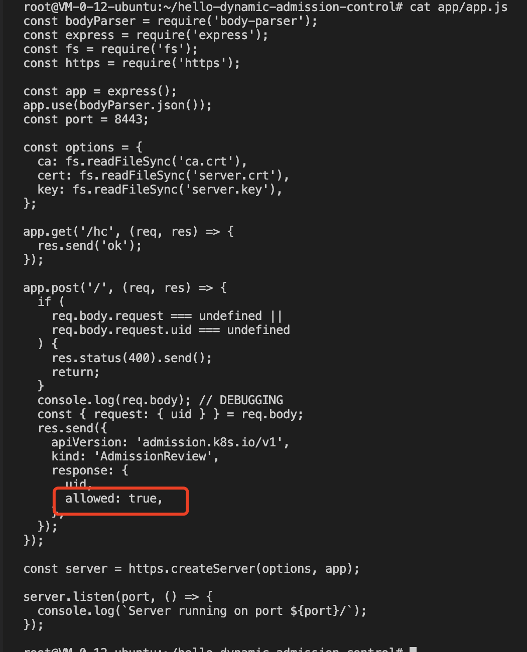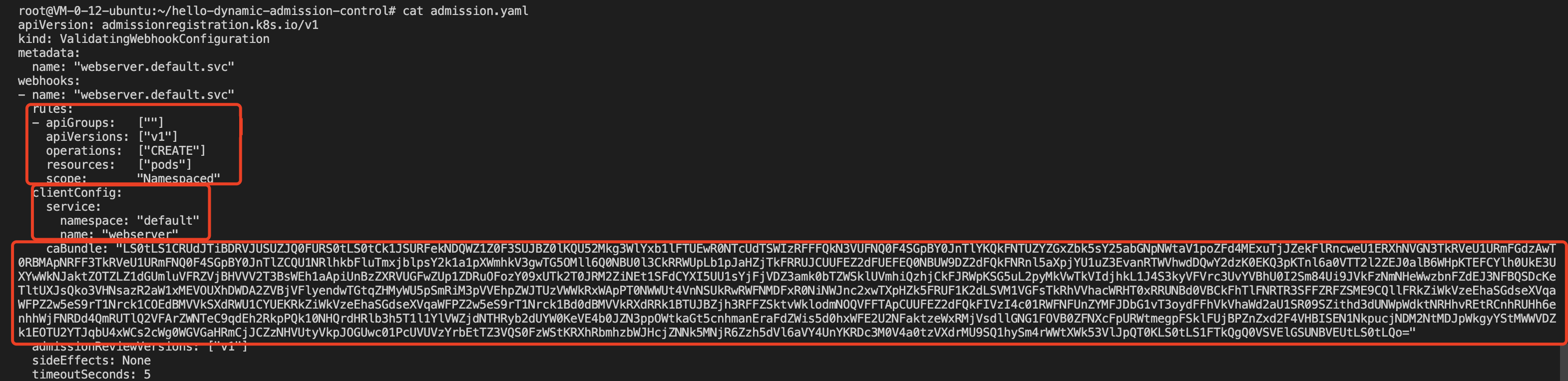 为了确保可访问性,示例代码 Fork 自 原代码库,示例代码实现了一个简单的动态准入 Webhook 请求和响应的接口,具体接口格式请参见 Webhook 请求和响应 。示例代码可在 示例代码 中获取,本文将使用其作为 Webhook 服务端代码。caBundle 内容。base64 编码 ca.crt 生成 caBundle 字段内容。cat ca.crt | base64 --wrap=0