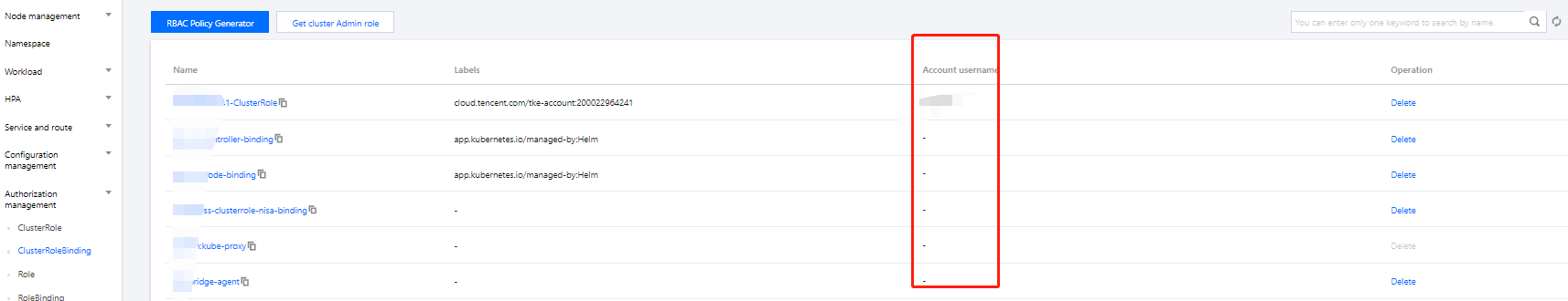 subjects:- apiGroup: rbac.authorization.k8s.iokind: Username: 700000xxxxxx-1650879262 # RBAC 里指定用户的用户名,需要拿到您指定用户的该信息