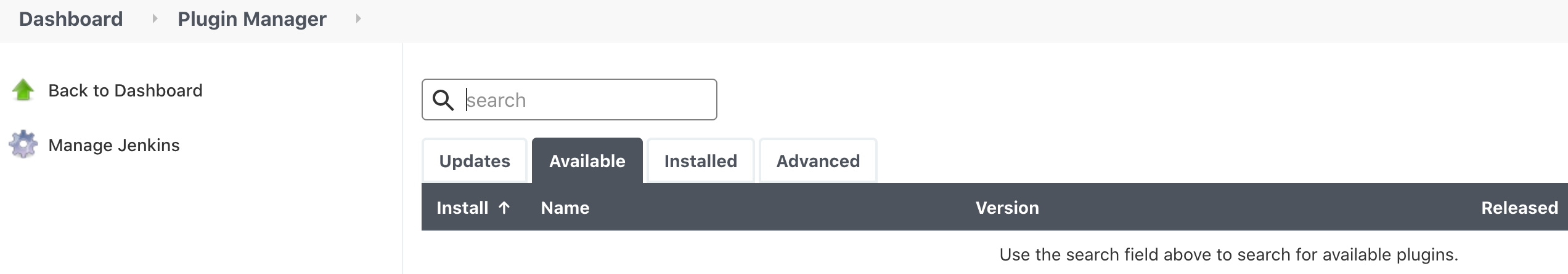 登录 Jenkins 后台,选择 Dashboard > Manage Jenkins > System Configuration > Manage Plugins,进入插件管理页面。