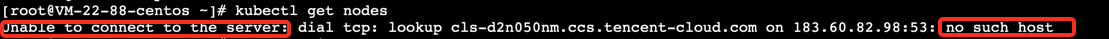 当前集群开启内网访问后,容器服务 TKE 默认通过域名访问集群,您需要在访问机上配置 Host 来进行内网域名解析。如未配置对应的域名解析规则(Host),在访问机上访问对应集群(运行 kubectl get nodes)时将会报错 “no such host”,如下图所示: