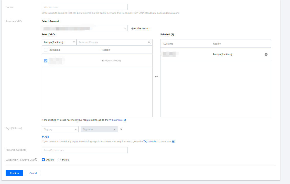 2. 单击新建私有域,配置以下选项(其他参数使用默认值即可),了解更多请参见 创建私有域文档。 域名:输入“tencent-cloud.com”(TKE 为集群访问分配的域名)。