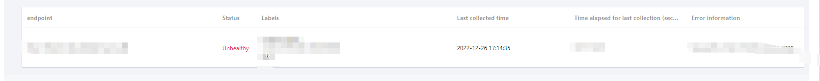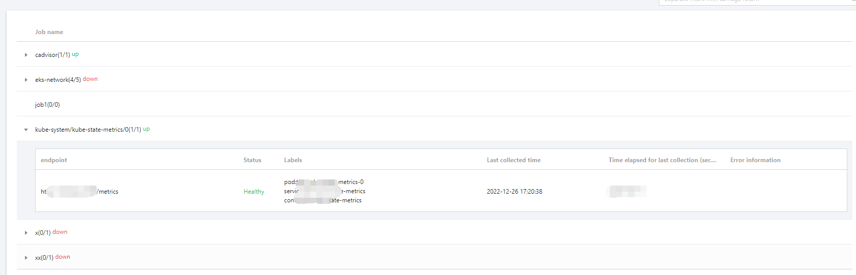 3. 在集群管理页面,单击实例右侧的查看采集目标。 4. 在 Targets 列表页即可查看当前数据拉取状态。如下图所示: