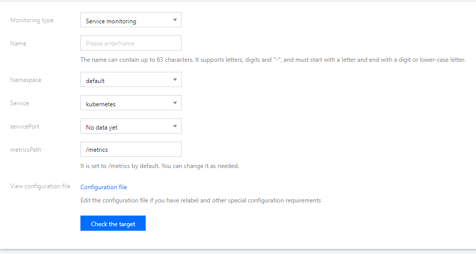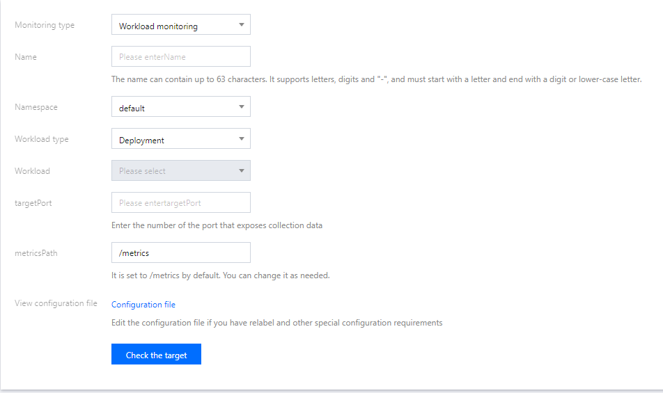 targetPort:填写暴露采集指标的目标端口,通过端口找到采集目标。若端口填写错误将无法获取到正确的采集目标。