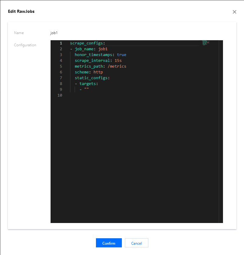 4. 在弹出的“编辑 RawJobs”窗口,查看 yaml 文件中当前配置的所有监控对象。如下图所示: