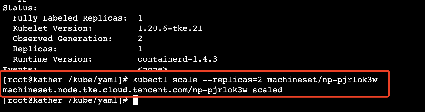 4. 根据命令 kubectl scale --replicas=2 machineset/np-pjrlok3w 执行节点池扩缩容: