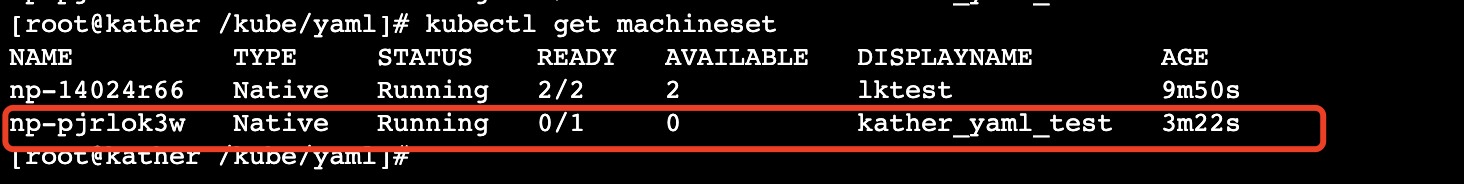 2. 根据命令kubectl get machineset查看 MachineSet np-pjrlok3w 状态。