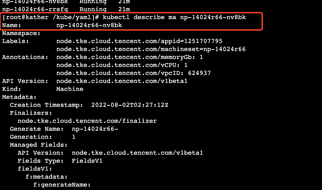 删除对应节点:kubectl delete machine np-xxxxxx-dtjhd