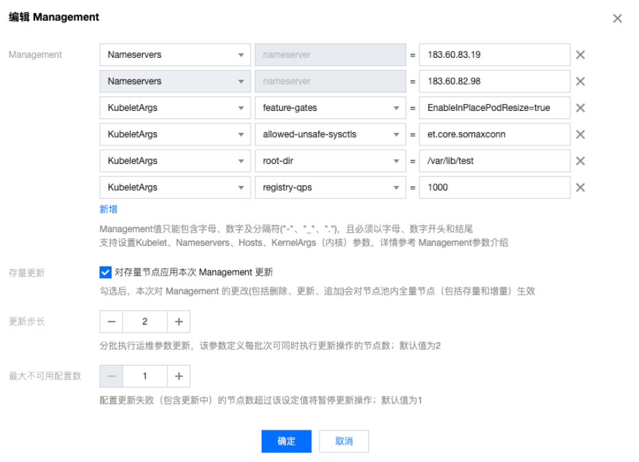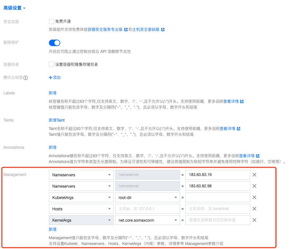KubeletArgs | 设置业务部署时需要自定义的 Kubelet 相关参数。 |