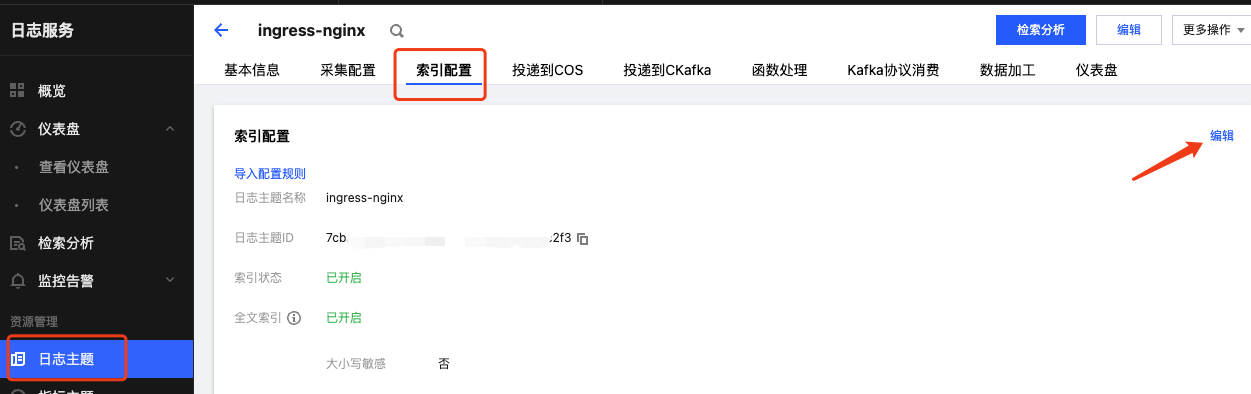 topicId,即日志主题 ID,表示采集的日志将会发送到该 CLS 日志主题里。apiVersion: cls.cloud.tencent.com/v1kind: LogConfigmetadata:name: ingress-nginx-controller # 日志采集规则名称,如果是多个 nginx ingress 实例,这里不能冲突spec:clsDetail:topicId: "********-****-****-****-************" # 替换日志主题的 IDlogType: fullregex_logextractRule:beginningRegex: (\\S+)\\s-\\s(\\S+)\\s\\[([^\\]]+)\\]\\s\\"(\\w+)\\s(\\S+)\\s([^\\"]+)\\"\\s(\\S+)\\s(\\S+)\\s\\"([^\\"]*)\\"\\s\\"([^\\"]*)\\"\\s(\\S+)\\s(\\S+)\\s\\[([^\\]]*)\\]\\s\\[([^\\]]*)\\]\\s(\\S+)\\s(\\S+)\\s(\\S+)\\s(\\S+)\\s(\\S+)\\s(\\S+)logRegex: (\\S+)\\s-\\s(\\S+)\\s\\[([^\\]]+)\\]\\s\\"(\\w+)\\s(\\S+)\\s([^\\"]+)\\"\\s(\\S+)\\s(\\S+)\\s\\"([^\\"]*)\\"\\s\\"([^\\"]*)\\"\\s(\\S+)\\s(\\S+)\\s\\[([^\\]]*)\\]\\s\\[([^\\]]*)\\]\\s(\\S+)\\s(\\S+)\\s(\\S+)\\s(\\S+)\\s(\\S+)\\s(\\S+)keys:- remote_addr- remote_user- time_local- timestamp- method- url- version- status- body_bytes_sent- http_referer- http_user_agent- request_length- request_time- proxy_upstream_name- proxy_alternative_upstream_name- upstream_addr- upstream_response_length- upstream_response_time- upstream_status- req_id- sys_addressinputDetail:type: container_stdoutcontainerStdout:namespace: ingress-nginx # nginx ingress 所在命名空间workload:kind: deploymentname: ingress-nginx-controller # 选中 nginx ingress controller 的 deployment 名称