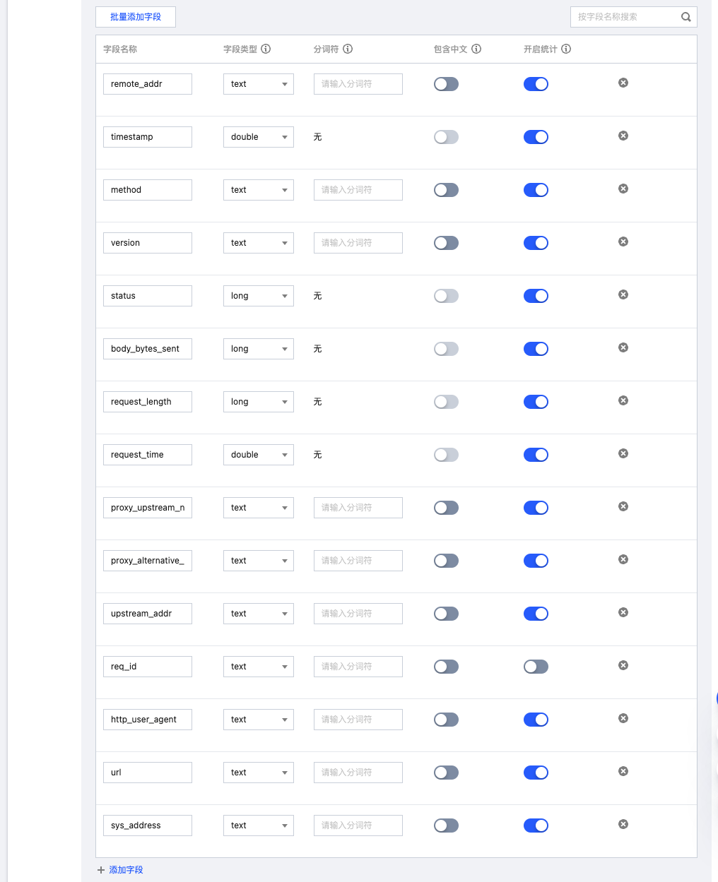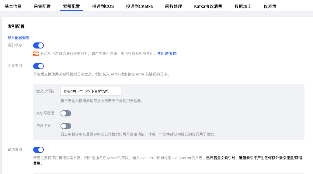 apiVersion: cls.cloud.tencent.com/v1kind: LogConfigmetadata:name: ingress-nginx-controller # 日志采集规则名称,如果是多个 nginx ingress 实例,这里不能冲突spec:clsDetail:topicId: "********-****-****-****-************" # 替换日志主题的 IDlogType: fullregex_logextractRule:beginningRegex: (\\S+)\\s-\\s(\\S+)\\s\\[([^\\]]+)\\]\\s\\"(\\w+)\\s(\\S+)\\s([^\\"]+)\\"\\s(\\S+)\\s(\\S+)\\s\\"([^\\"]*)\\"\\s\\"([^\\"]*)\\"\\s(\\S+)\\s(\\S+)\\s\\[([^\\]]*)\\]\\s\\[([^\\]]*)\\]\\s(\\S+)\\s(\\S+)\\s(\\S+)\\s(\\S+)\\s(\\S+)\\s(\\S+)logRegex: (\\S+)\\s-\\s(\\S+)\\s\\[([^\\]]+)\\]\\s\\"(\\w+)\\s(\\S+)\\s([^\\"]+)\\"\\s(\\S+)\\s(\\S+)\\s\\"([^\\"]*)\\"\\s\\"([^\\"]*)\\"\\s(\\S+)\\s(\\S+)\\s\\[([^\\]]*)\\]\\s\\[([^\\]]*)\\]\\s(\\S+)\\s(\\S+)\\s(\\S+)\\s(\\S+)\\s(\\S+)\\s(\\S+)keys:- remote_addr- remote_user- time_local- timestamp- method- url- version- status- body_bytes_sent- http_referer- http_user_agent- request_length- request_time- proxy_upstream_name- proxy_alternative_upstream_name- upstream_addr- upstream_response_length- upstream_response_time- upstream_status- req_id- sys_addressinputDetail:type: container_filecontainerFile:namespace: ingress-nginx # nginx ingress 所在命名空间workload:kind: deploymentname: ingress-nginx-controller # 选中 nginx ingress controller 的 deployment 名称container: controllerlogPath: /var/log/nginxfilePattern: nginx_access.log
