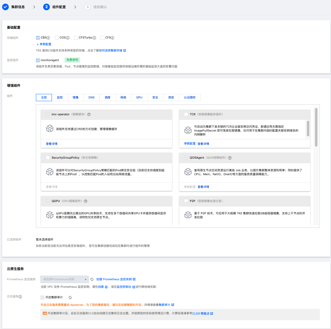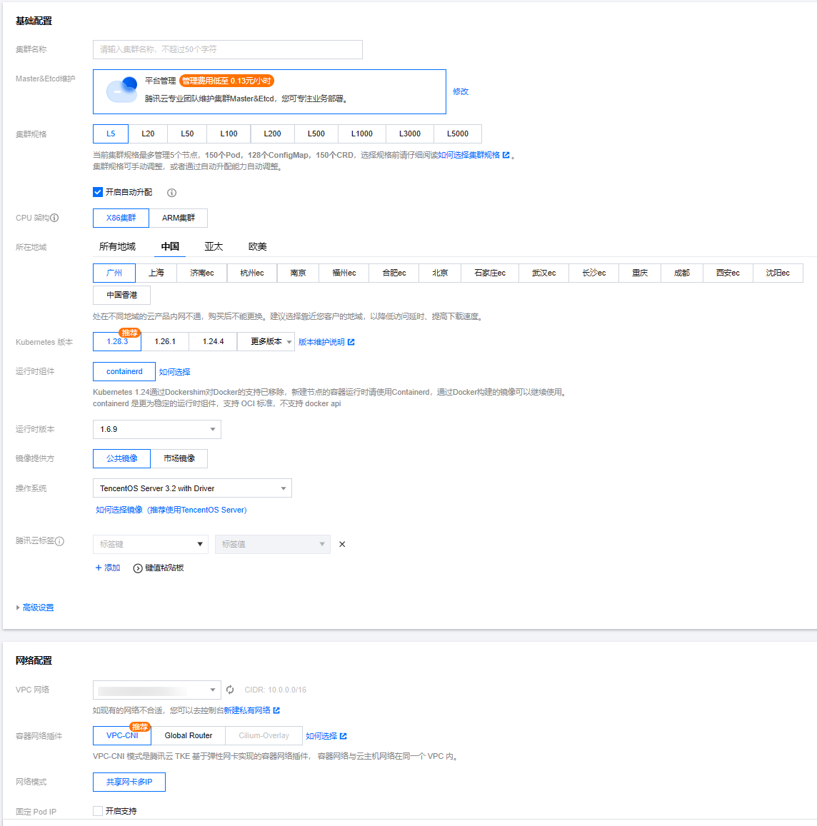 Master&Etcd 维护 | 平台管理:由腾讯云专业团队维护集群控制面组件,需支付一定的管理费用,详情请参见 集群管理费用。 自行维护:需用户自行购买、维护和管理控制面资源,平台不提供服务保障。 |