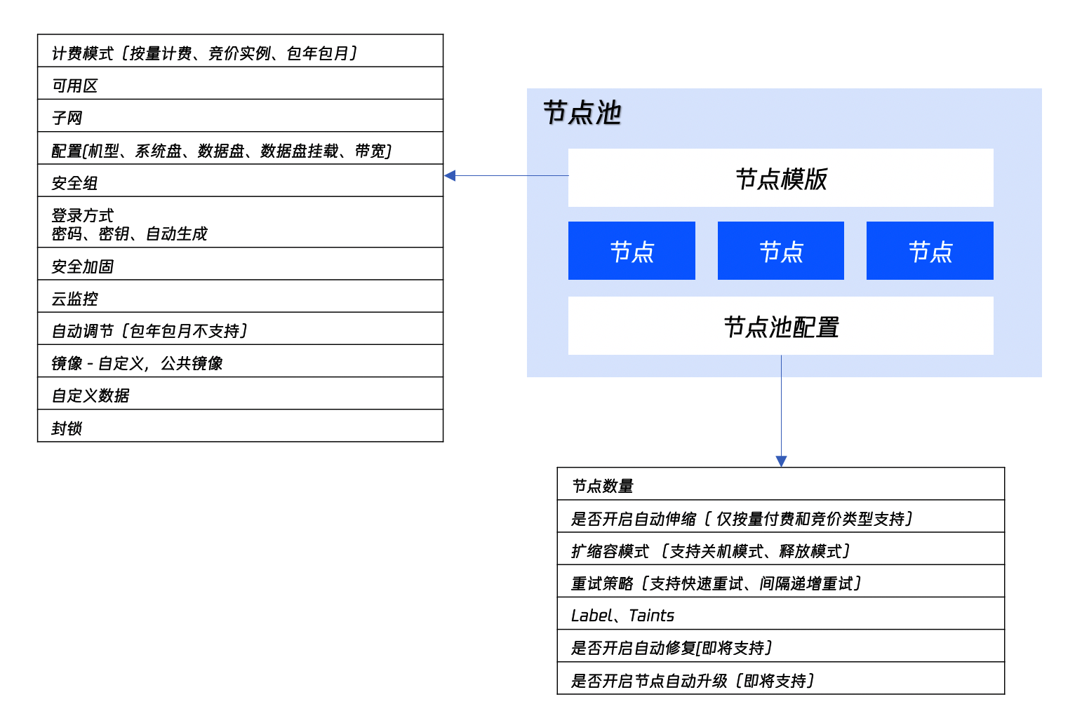 为了帮助您高效管理 Kubernetes 集群中的节点,腾讯云容器服务 TKE 引入了节点池的概念。节点池是一组具有相似属性的节点的逻辑集合,一个集群中可以创建多个不同配置和类型的节点池。节点池的配置包含节点的资源属性和 Kubernetes 属性,如计费模式、规格、可用区、标签、污点等。通过节点池的基本功能,您可以方便快捷地创建、管理和销毁节点,从而实现更灵活和高效的资源管理。