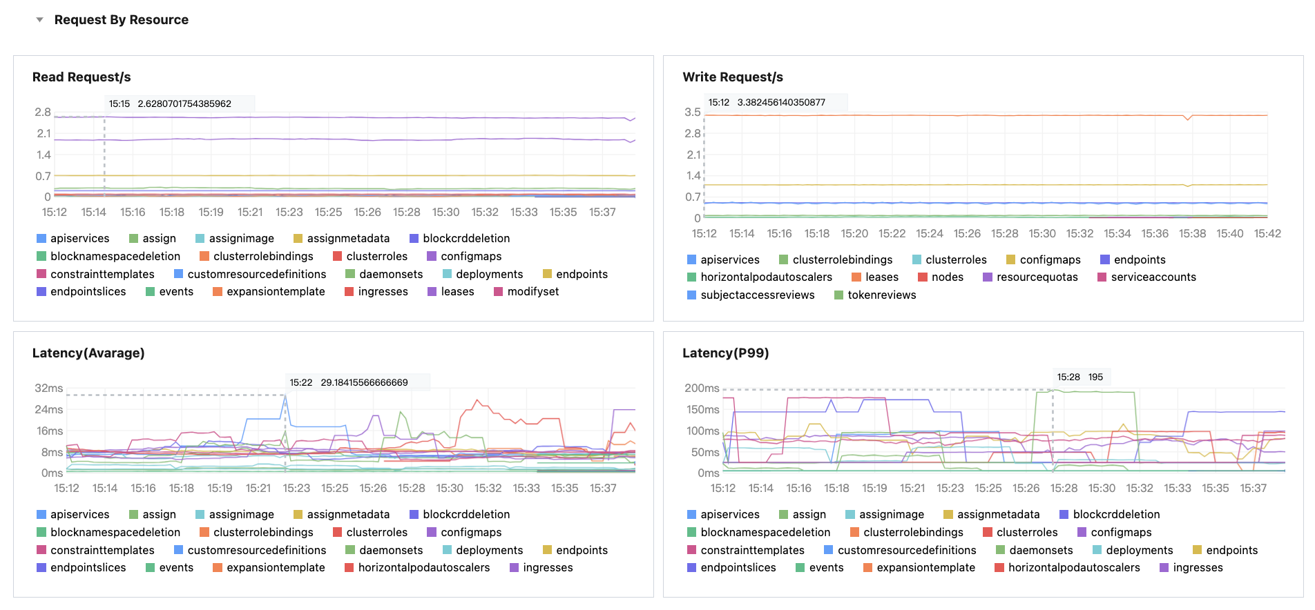 Latency(P99) | apiserver 请求时延 P99 | apiserver_request_duration_seconds_bucket | apiserver 请求时延P99(按资源分类)。单位:毫秒。 |