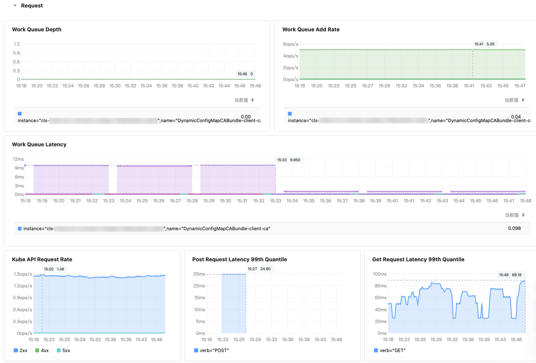 请求分析 | workqueue_queue_duration_seconds_bucket | Histogram | 任务在 Workqueue 中存在的时长。Bucket 阈值为{10-8, 10-7, 10-6, 10-5, 10-4, 10-3, 10-2, 10-1, 1, 10}。单位:秒。 |