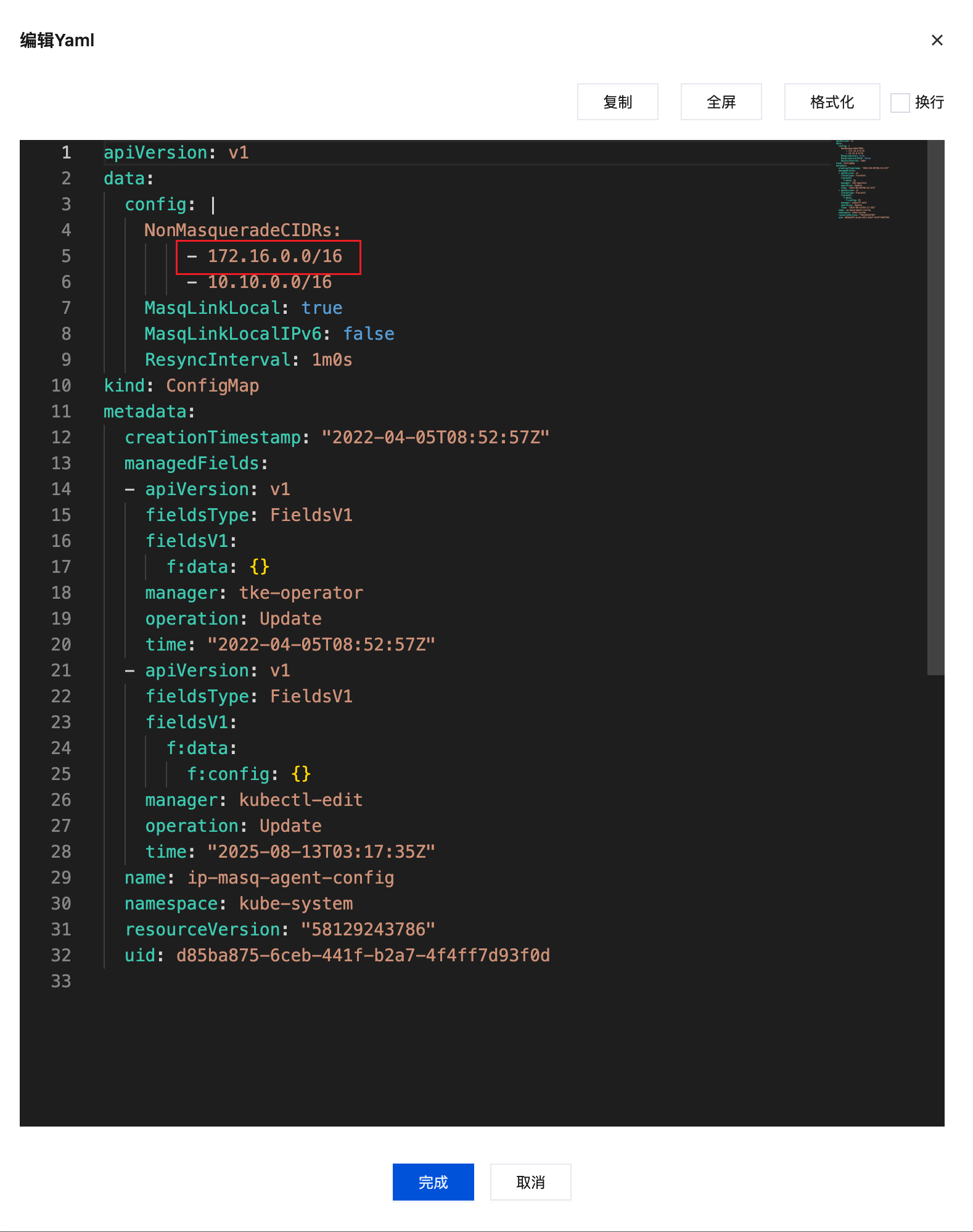 2. 将缺失的集群容器网段追加到 NonMasqueradeCIDRs 数组并保存。如下图所示: