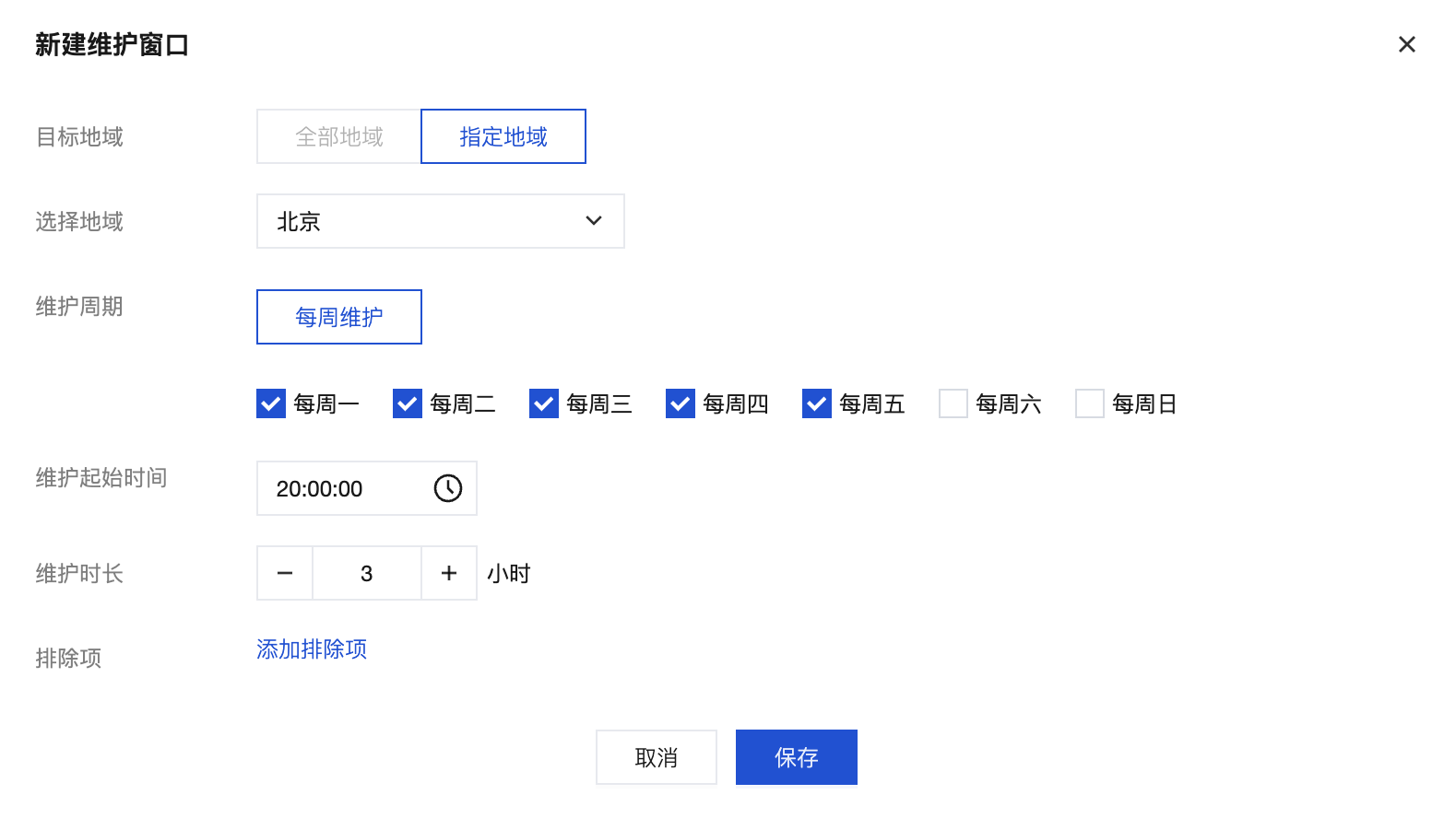 维护周期:用户需要指定该地域集群每周的维护日期(如周一至周五),至少需要指定一个维护日期。