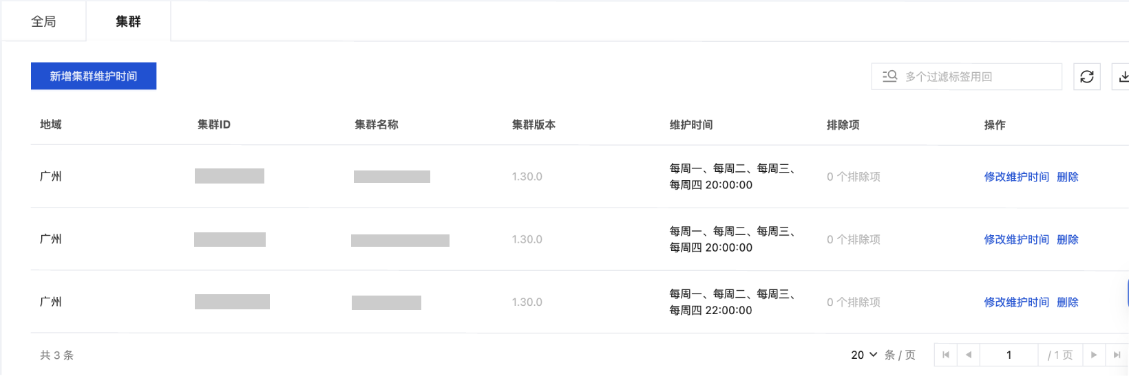 全局维护窗口和排除项是地域维度的配置,对用户账号下指定地域的所有集群生效。在新建全局维护窗口和排除项时,用户可以选择目标地域为全部地域或指定地域(如广州)。全局维护窗口和排除项支持用户为该地域配置以下维护时间信息: