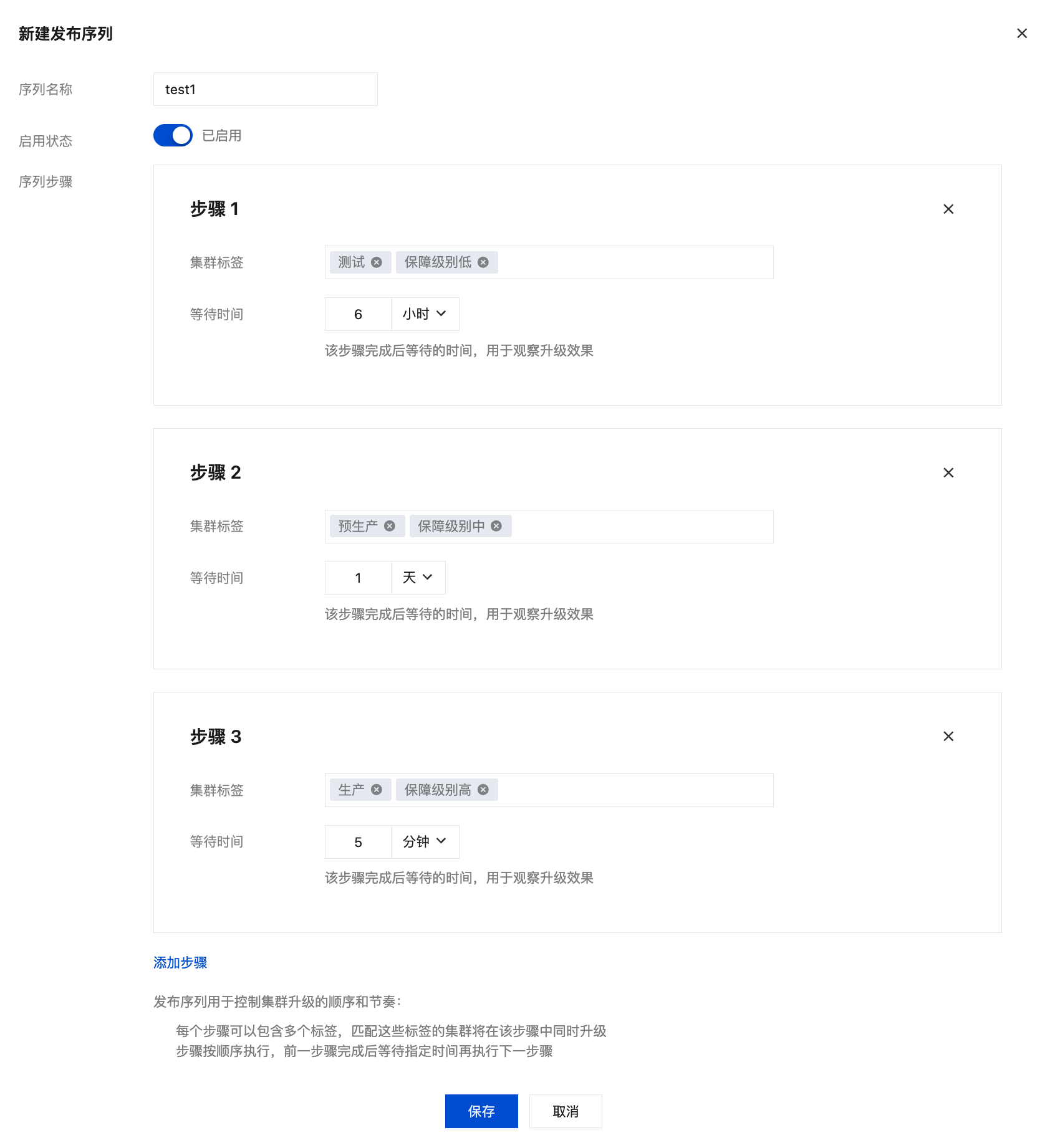 启用状态:启用/关闭升级发布序列。若关闭发布序列,则集群无法使用发布序列升级模式。