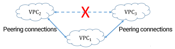 例如,如下图所示,VPC 1 与 VPC 2 建立了对等连接,VPC 1 和 VPC 3 也建立了对等连接。然而由于对等连接的不传递性,VPC 2 和 VPC 3 的流量不能互通。