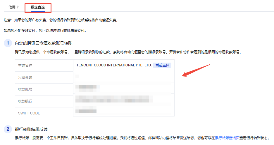 腾讯云国际站银企直连专属账号打款功能已经上线,对于有销售代表跟进的客户可以申请开通一个与自己账号唯一匹配的腾讯云线下汇款专属账号,系统会根据您的汇款记录,自动上报至财经系统,实现快速自动充值入账。如需开通银企直连功能请前往:腾讯云官网费用中心 > 资金管理 > 付款,单击 银企直连。 如页面暂不支持该功能的开通,请选择其他充值方式,具体操作流程请参见相关指引 充值流程说明。 汇款流程