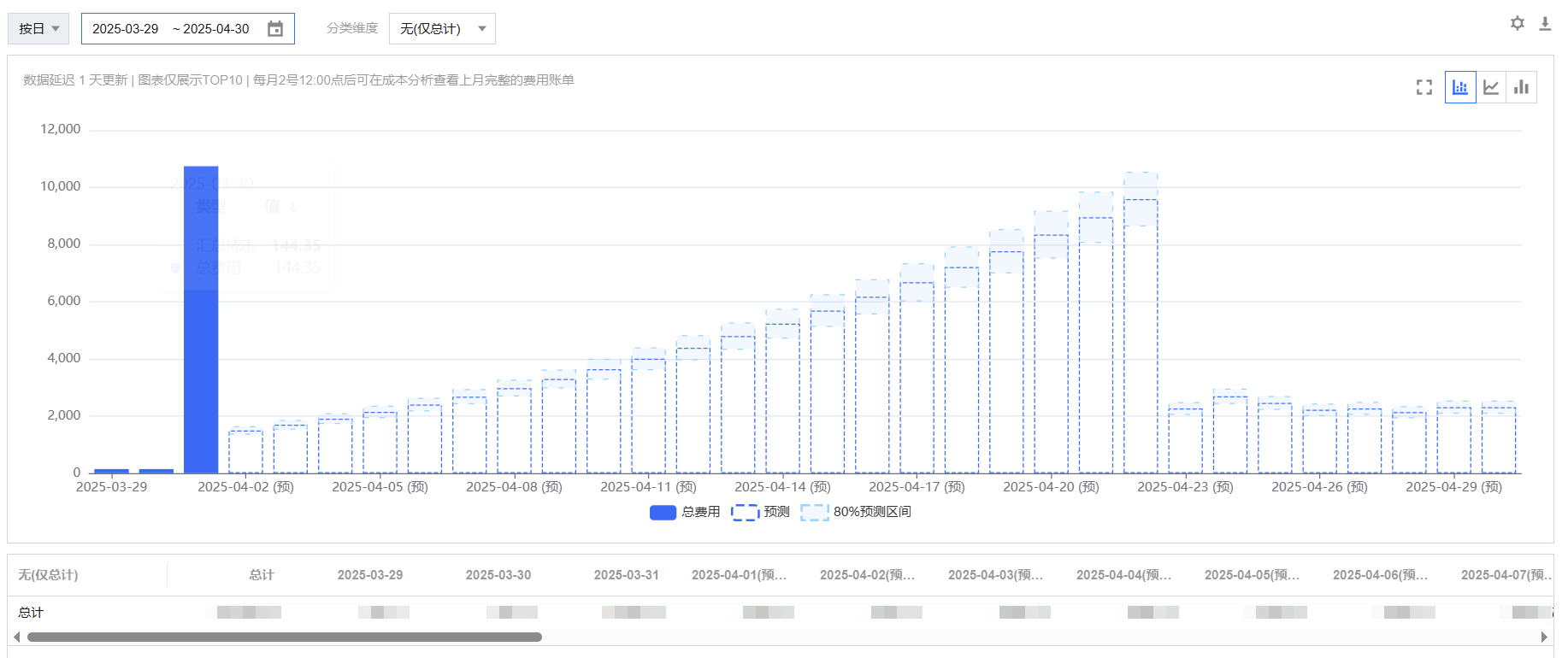 时间粒度:费用预测支持按日级和按月级时间粒度,不支持小时级时间粒度。