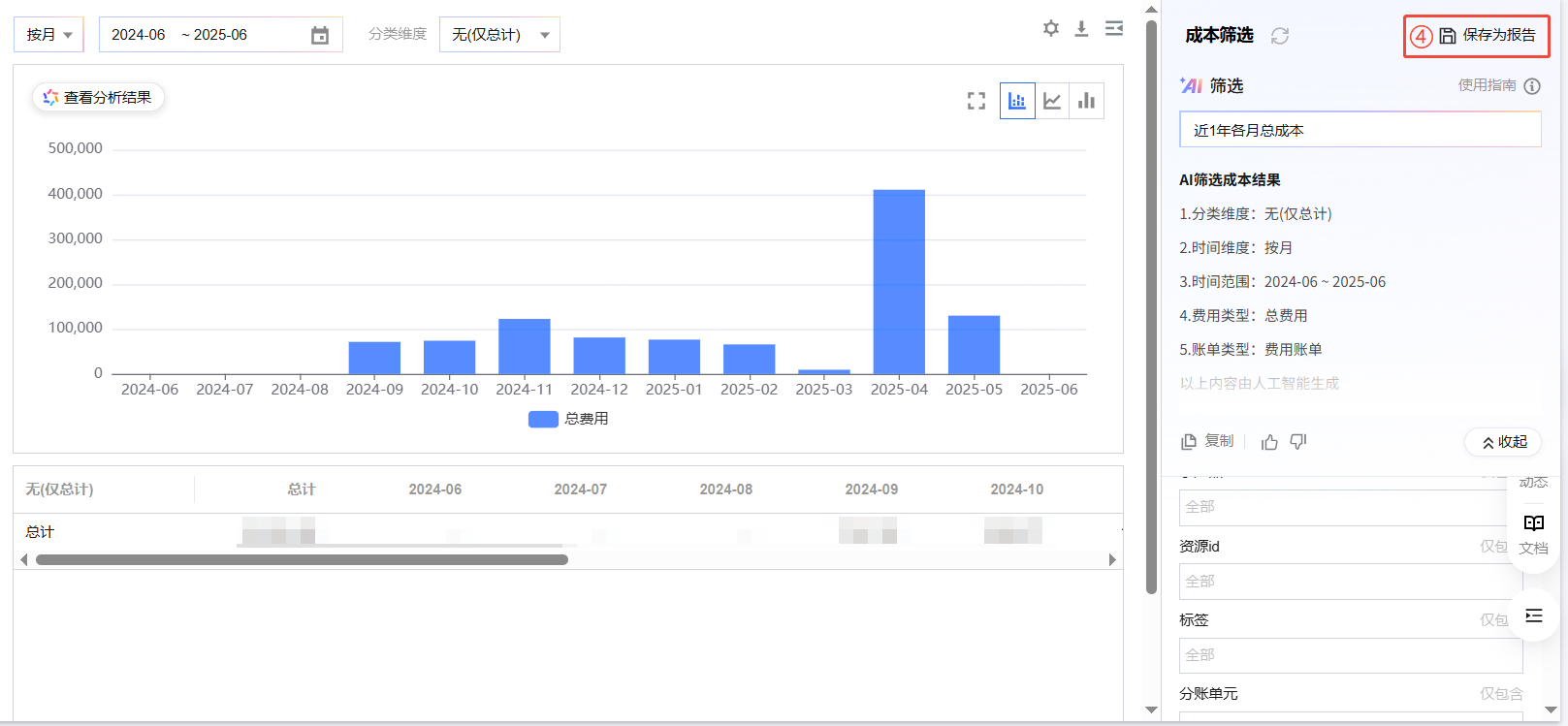 4. 保存报告:如需要您可单击成本筛选右上方的保存为报告,将 AI 智能筛选结果保存为正式报告,便于后续查阅与分享。