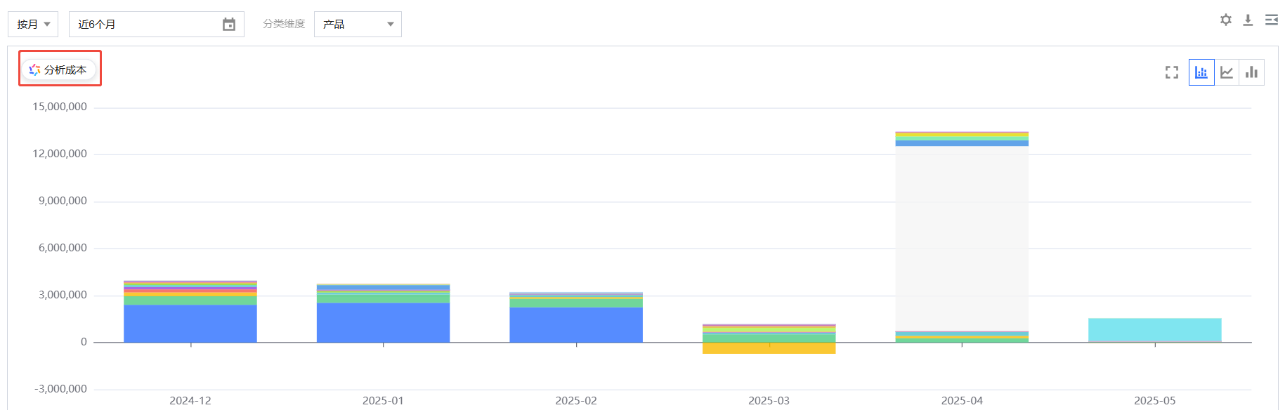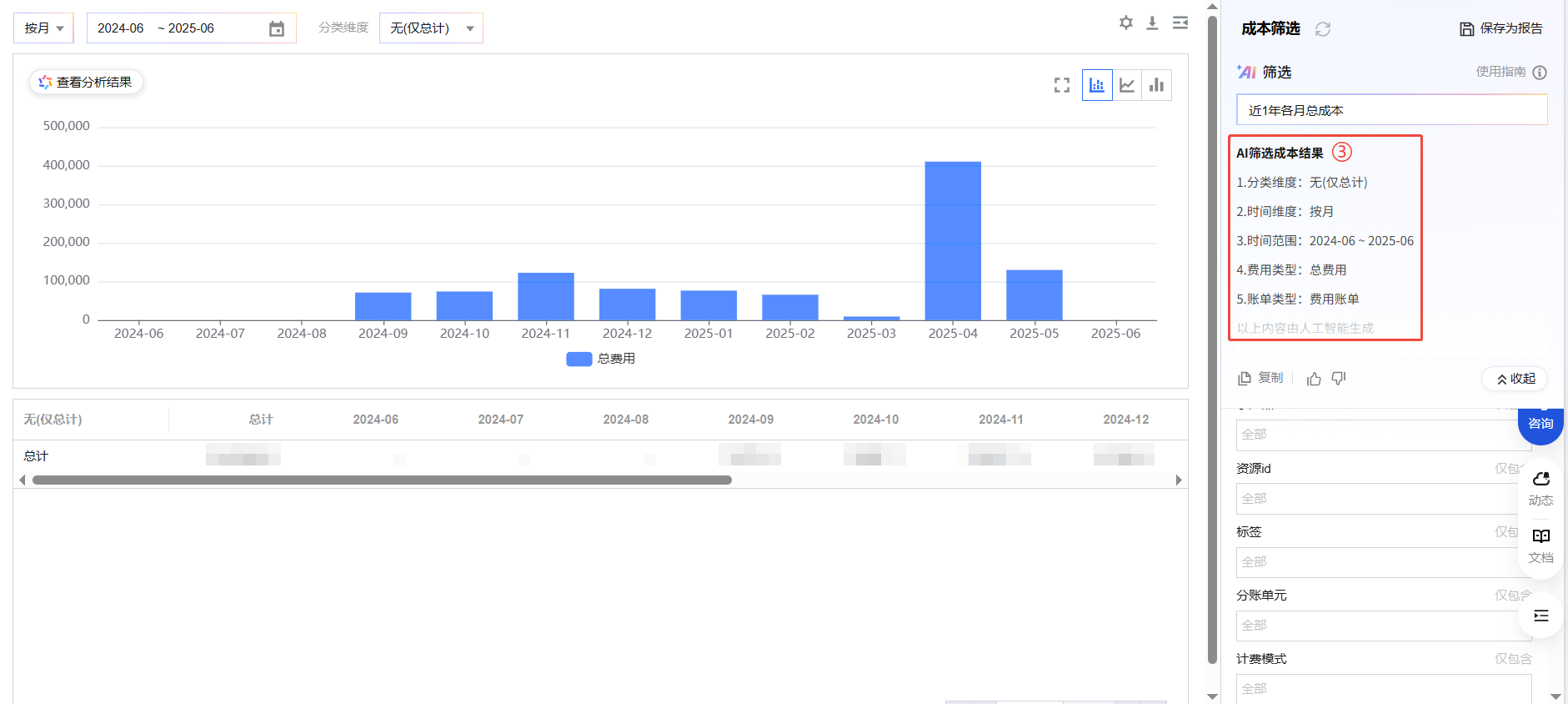 1. 登录费用中心 > 成本分析 页面,在成本筛选 > AI 筛选下方的输入框中,输入您的成本分析需求(例如:"近1年各月总成本"),单击搜索。 2. AI 将为您提供如下内容: