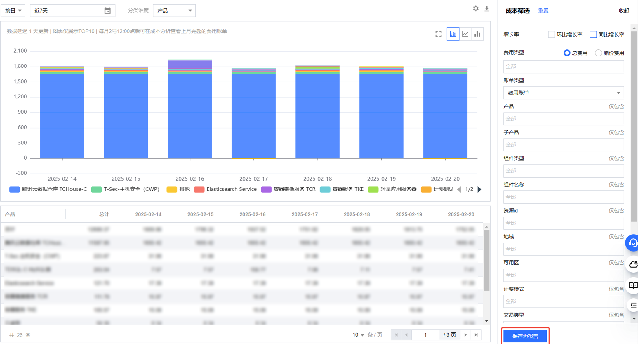 成本分析按日、按月级数据更新时效为:费用账单明细数据更新后 + 2小时(除分类维度为“资源 ID”时是T+2更新),最迟为明细更新后 + 4小时(由于任务跑完需要时间,时间最长不超过2小时);且当月数据不包含未出账的后付费数据。