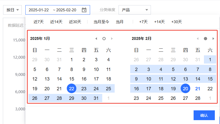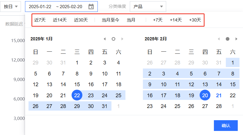 日级支持近7天、14天、30天、当月至今、当月、+7天、+14天、+30天。