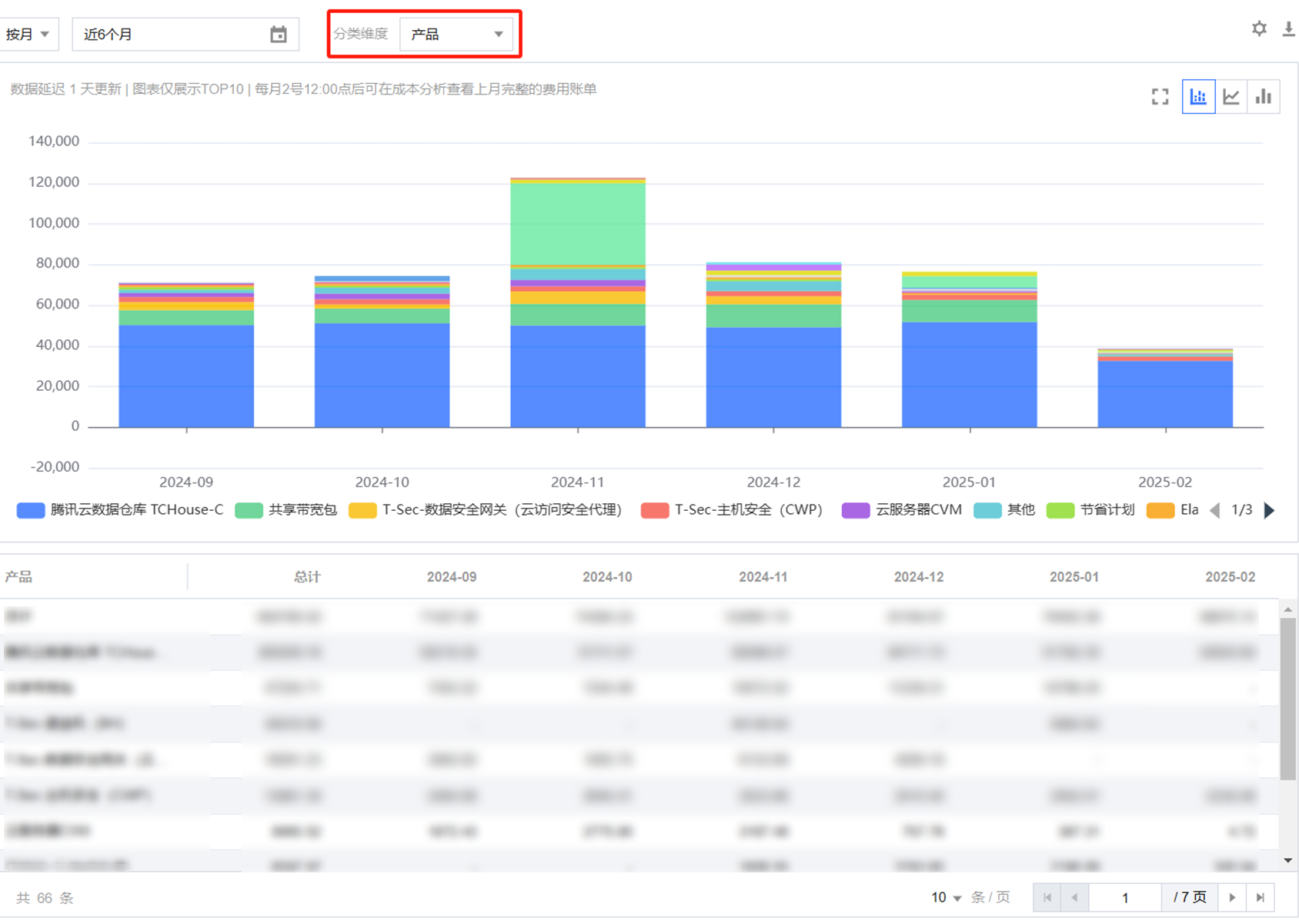 目前支持维度:费用类型、账单类型、产品、子产品、组件类型、组件名称、资源 ID、地域、可用区、交易类型、计费模式、标签、项目、支付者账号、使用者账号、分账单元。