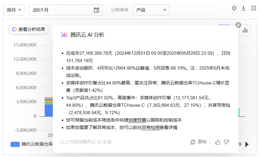 在 成本分析 页面,单击分析成本,腾讯云 AI 将基于您的成本数据进行智能分析,并生成结构化分析报告,帮助您快速洞察成本情况。 腾讯云 AI 分析维度为:总成本、成本趋势、成本驱动因素、成本集中度等维度。
