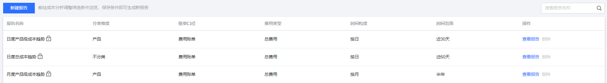 腾讯云为客户预设三个默认报告,分别为:日度产品级成本趋势、日度总成本趋势、月度产品级成本趋势。可在 成本报告 页面查看,不支持修改删除。 费用预测