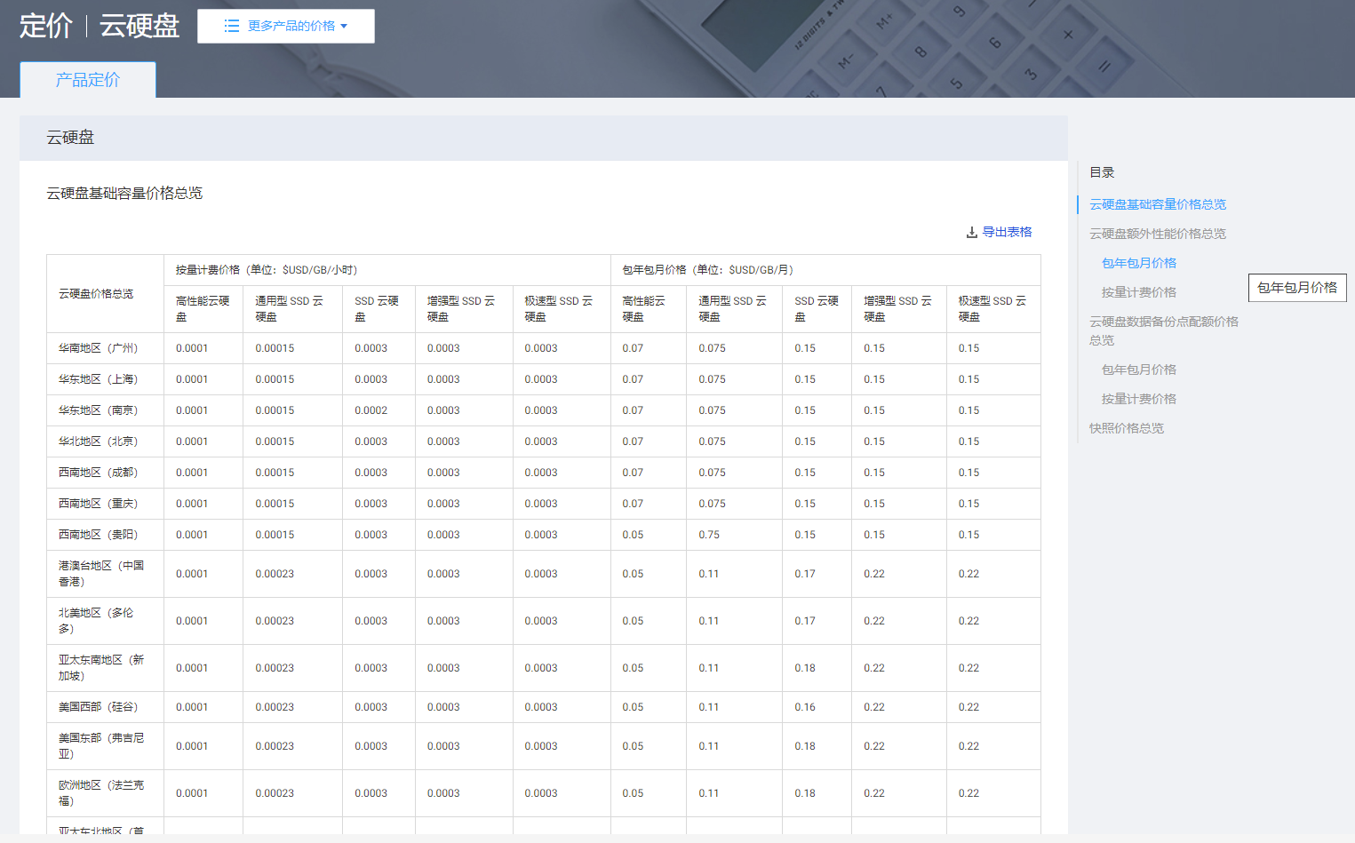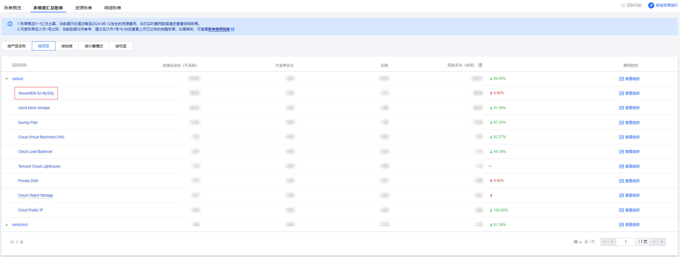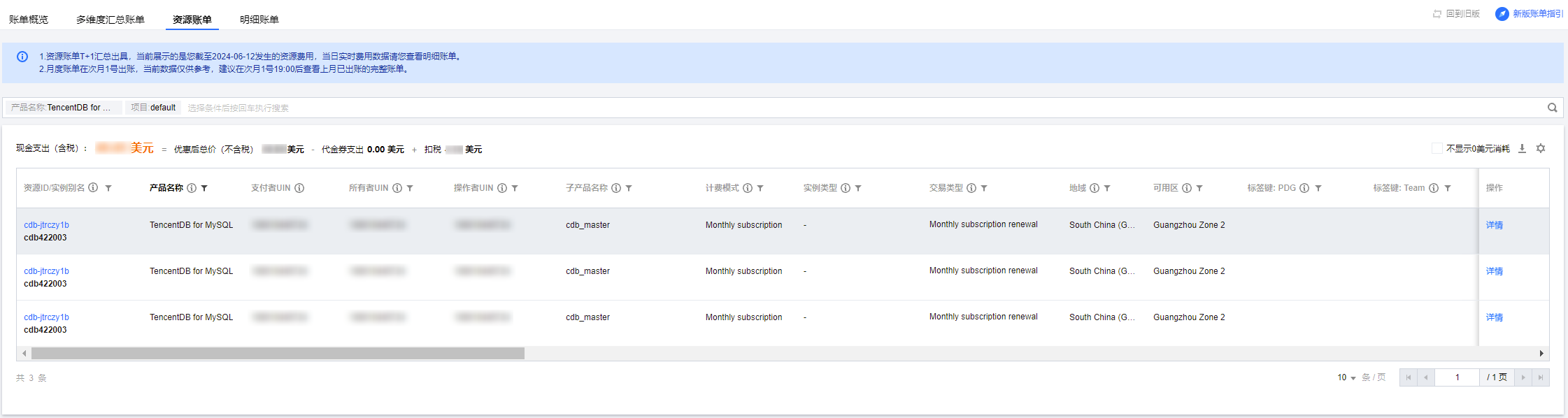 某个项目下对应产品的资源账单费用详情,如下图所示: