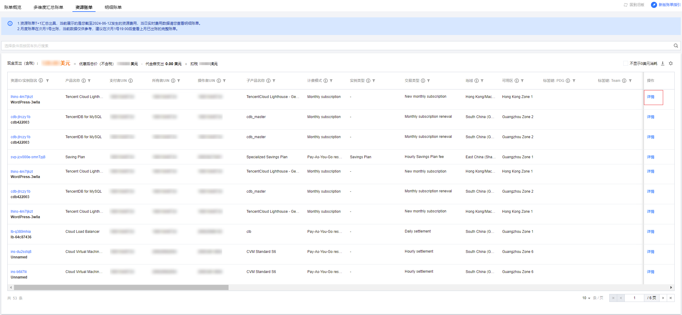 字段解释说明:资源账单和明细账单表头增加字段说明,便于快捷了解各字段的含义。更多字段说明请参见 账单字段说明。 详情:单击各资源操作列详情,即可查看该资源详情、费用组成、近半年/一年的费用趋势。