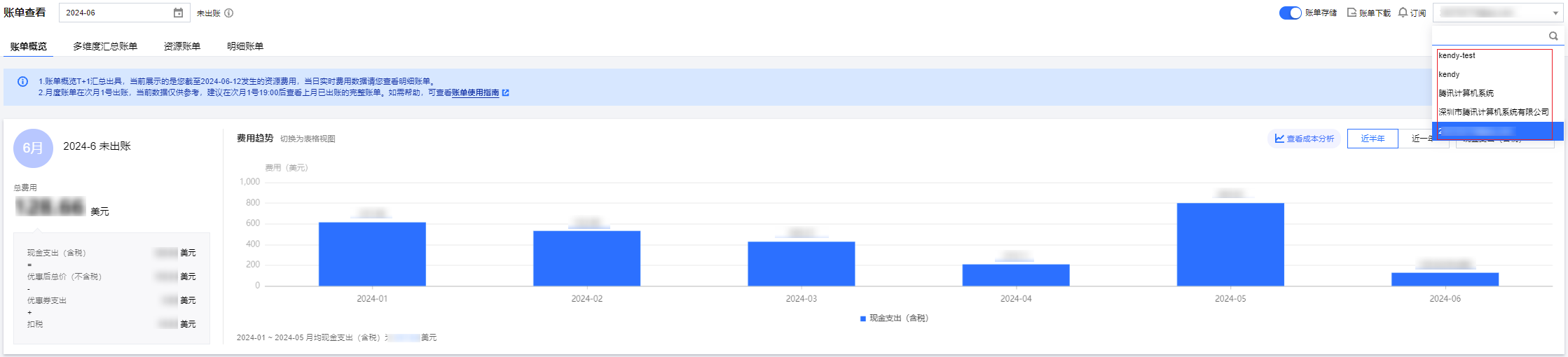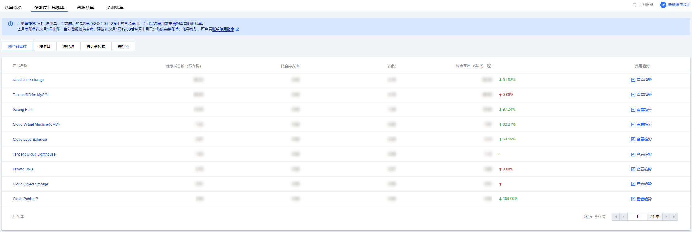多维汇总账单数据 T+1 出具,非实时数据。实时数据请前往 明细账单 查看。 通过产品名称、项目、地域、计费模式、标签多维度汇总的账单费用。支持查看总费用环比变化率、变化趋势。也支持查看各维度汇总费用近半年的变化趋势。