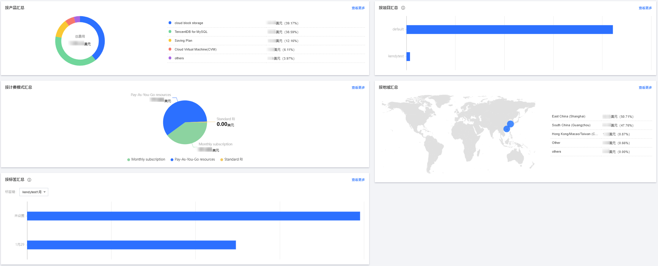 各类维度汇总视图支持以下维度:按产品、按项目、按计费模式、按地域、按标签汇总。