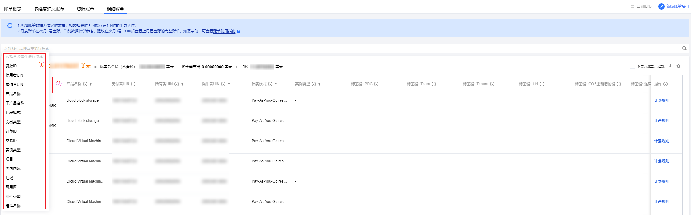 前往标签列表页创建标签,在各云资源控制台给资源分配对应的标签值; 前往分账标签页将希望应用在账单的标签键设置为分账标签,标签更多功能说明请参见分账标签。 单击产品名称可跳转至资源账单页,查看该产品的资源账单费用详情。项目、地域、计费模式、标签也都支持该操作。 某个产品的资源账单费用详情,如下图所示: