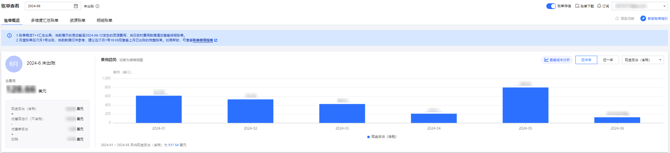 账单概览数据 T+1 出具,非实时数据。实时数据请前往 明细账单 查看。 您可以通过概览视图了解月度账单总费用构成、月度账单费用趋势图、以及各类维度账单费用构成概况。