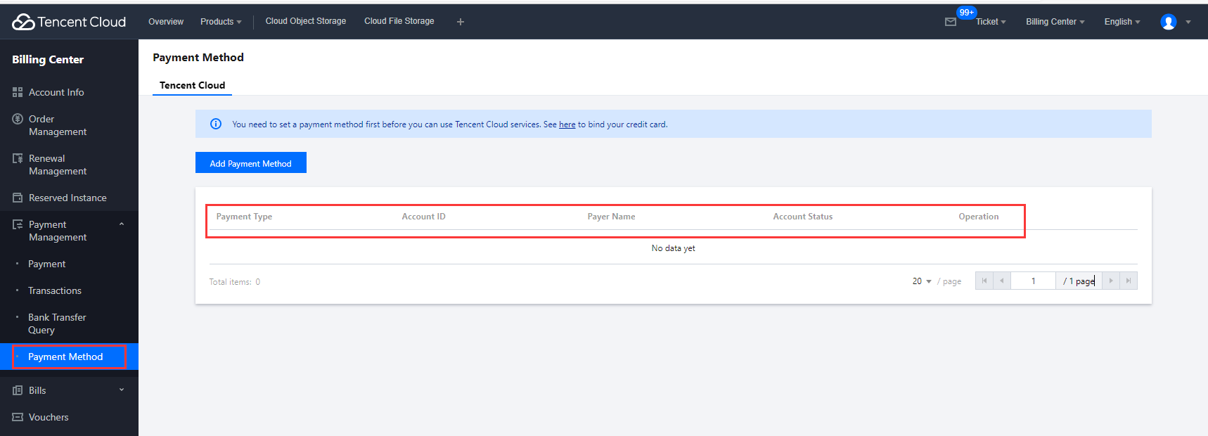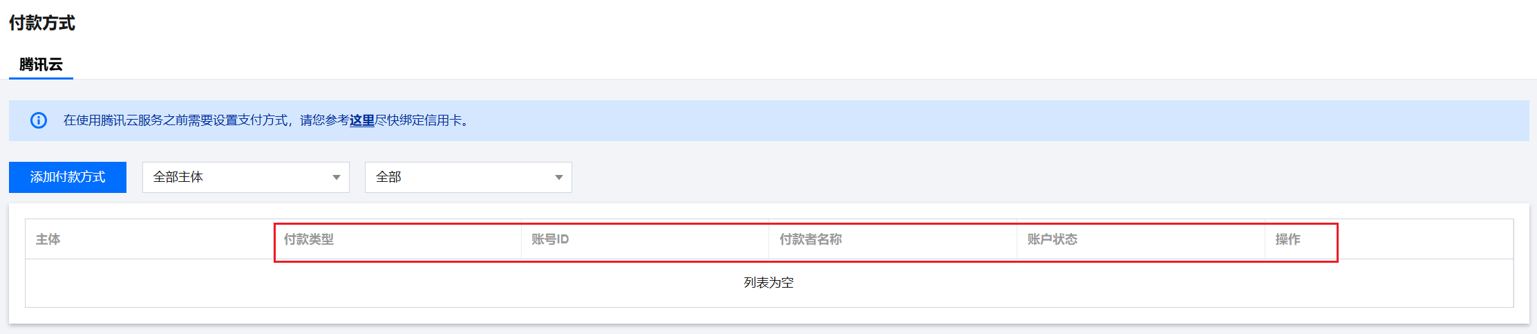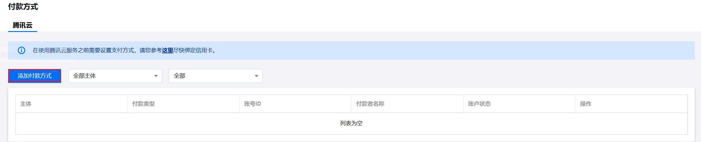 腾讯云用户可以使用支付方式模块查询,添加,删除和设置默认支付方式,用户需保留至少一个支付方式,账号未绑定支付方式可参照下方流程进行绑定。