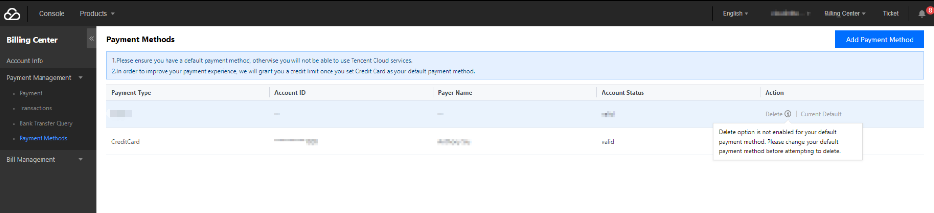 用户可以单击“Delete”来删除所选的付款方式。但是无法删除默认付款方式,您可以选择有效的付款方式或添加有效的付款方式,然后点击"Set as default"以将其标记为默认付款方式。之后,先前的默认付款方式将成为可以保留或删除的通用付款方式。