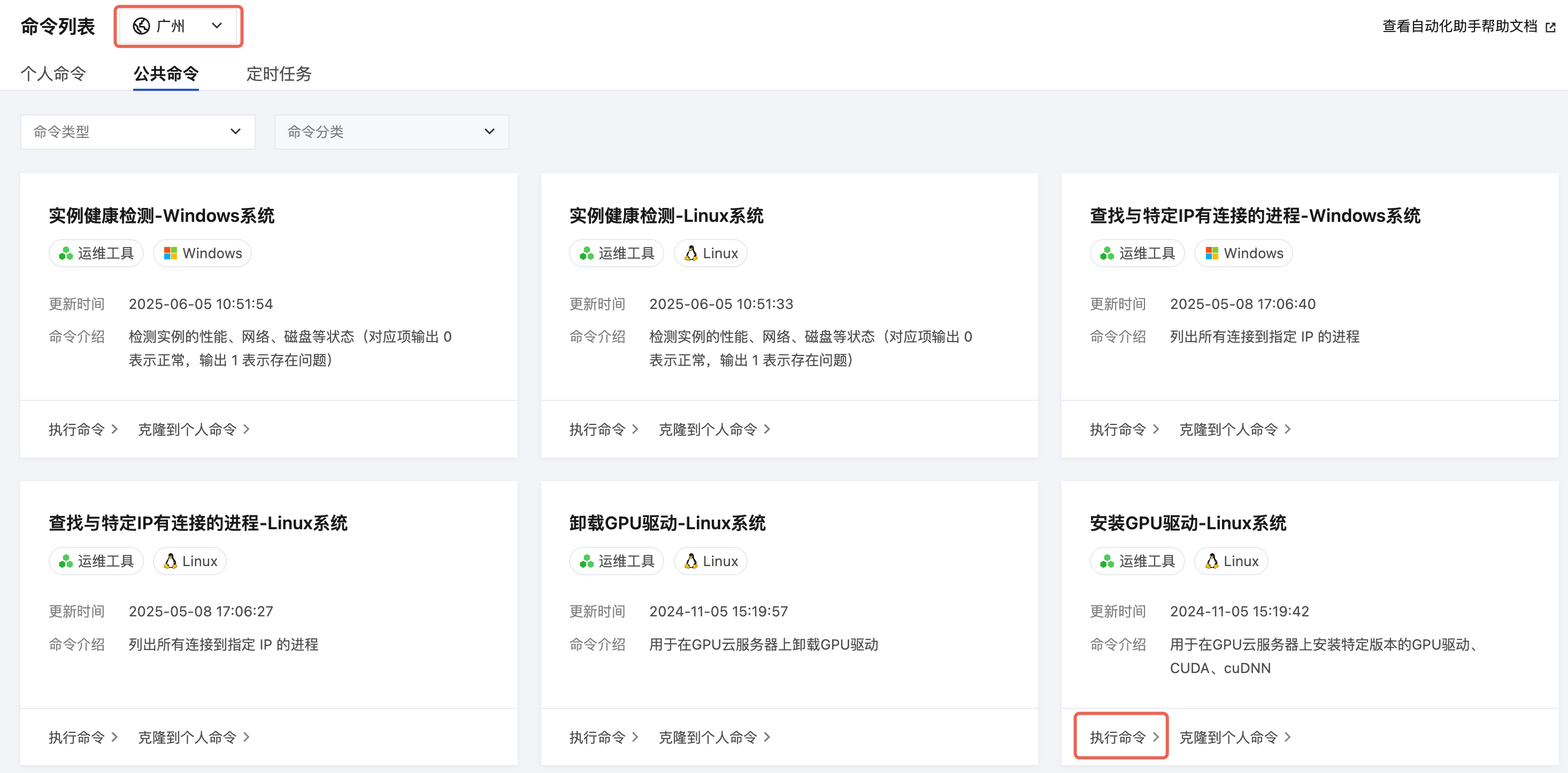方式三:使用 TAT 自动化助手安装驱动 | 进入控制台,使用 TAT 执行公共命令执行驱动安装脚本 |