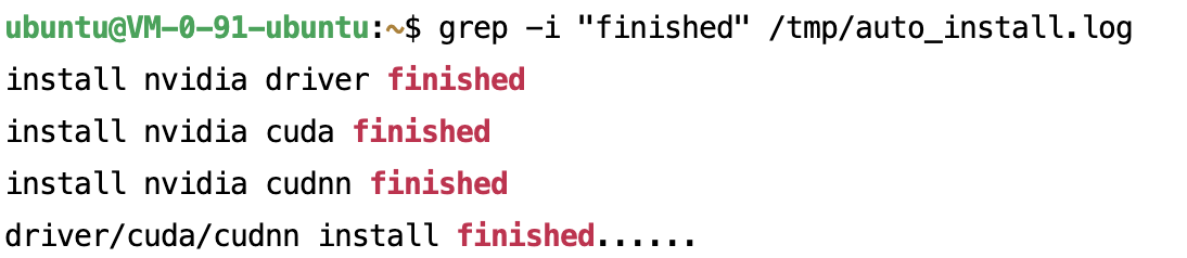 grep -i "finished" /tmp/auto_install.log查看驱动、CUDA、cuDNN 安装记录:
