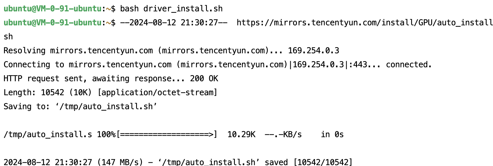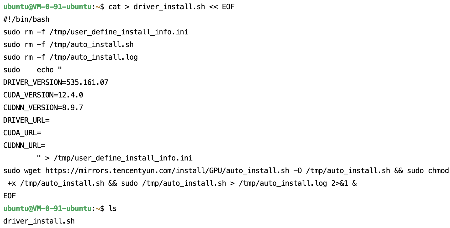 driver_install.sh。cat > driver_install.sh << EOF#!/bin/bashsudo rm -f /tmp/user_define_install_info.inisudo rm -f /tmp/auto_install.shsudo rm -f /tmp/auto_install.logsudo echo "DRIVER_VERSION=535.161.07CUDA_VERSION=12.4.0CUDNN_VERSION=8.9.7DRIVER_URL=CUDA_URL=CUDNN_URL=" > /tmp/user_define_install_info.inisudo wget https://mirrors.tencentyun.com/install/GPU/auto_install.sh -O /tmp/auto_install.sh && sudo chmod +x /tmp/auto_install.sh && sudo /tmp/auto_install.sh > /tmp/auto_install.log 2>&1 &EOF