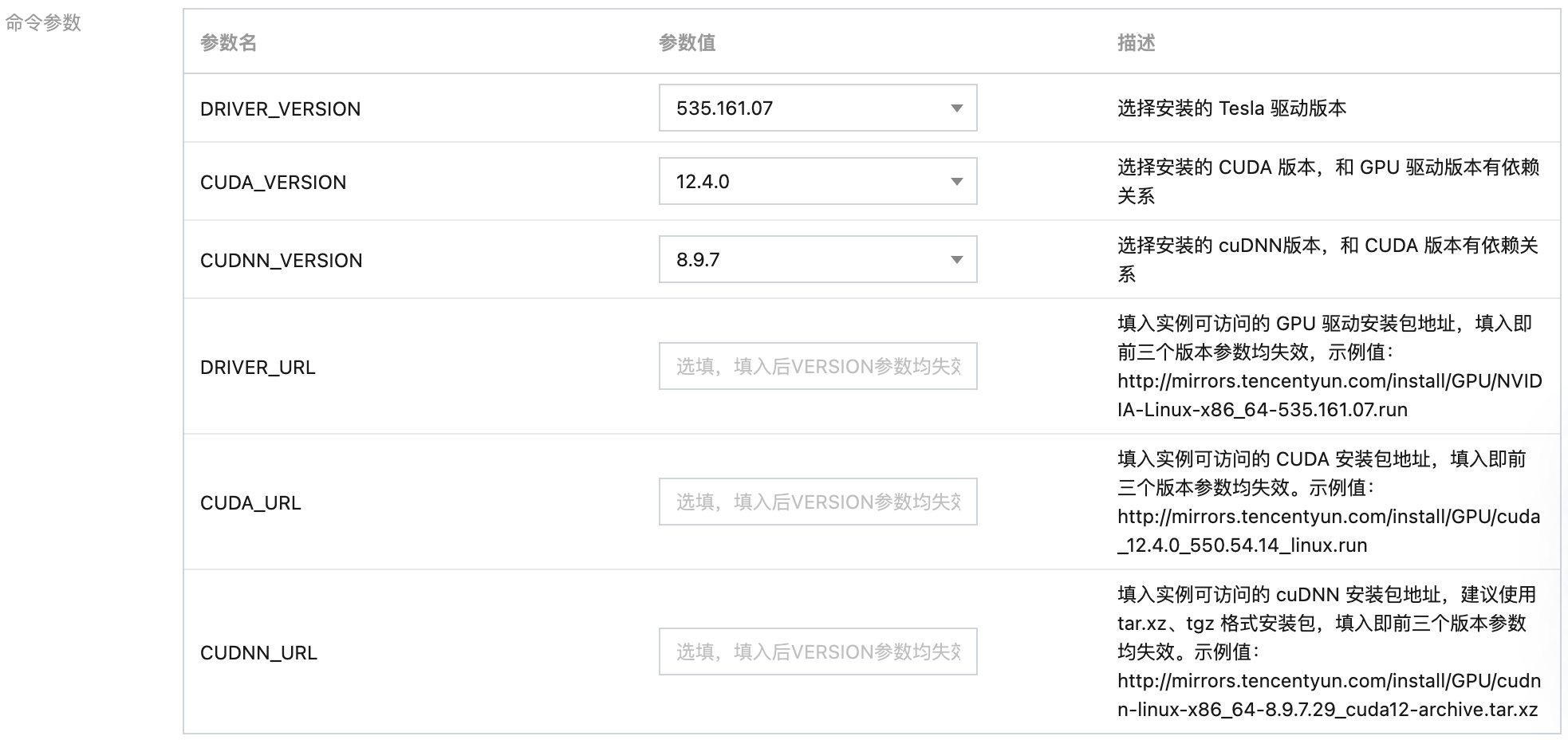 DRIVER_VERSION=CUDA_VERSION=CUDNN_VERSION=#确保实例可正常下载URL对应安装包DRIVER_URL=http://mirrors.tencentyun.com/install/GPU/NVIDIA-Linux-x86_64-535.161.07.runCUDA_URL=http://mirrors.tencentyun.com/install/GPU/cuda_12.4.0_550.54.14_linux.run#cuDNN建议使用tar.xz、tgz格式安装包CUDNN_URL=http://mirrors.tencentyun.com/install/GPU/cudnn-linux-x86_64-8.9.7.29_cuda12-archive.tar.xz