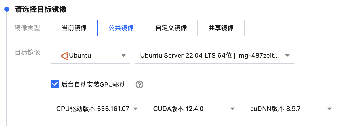方式一:重装公共镜像时自动安装驱动 | 在重装系统页面选择镜像步骤,选择公共镜像并勾选后台自动安装 GPU 驱动选项。 | |